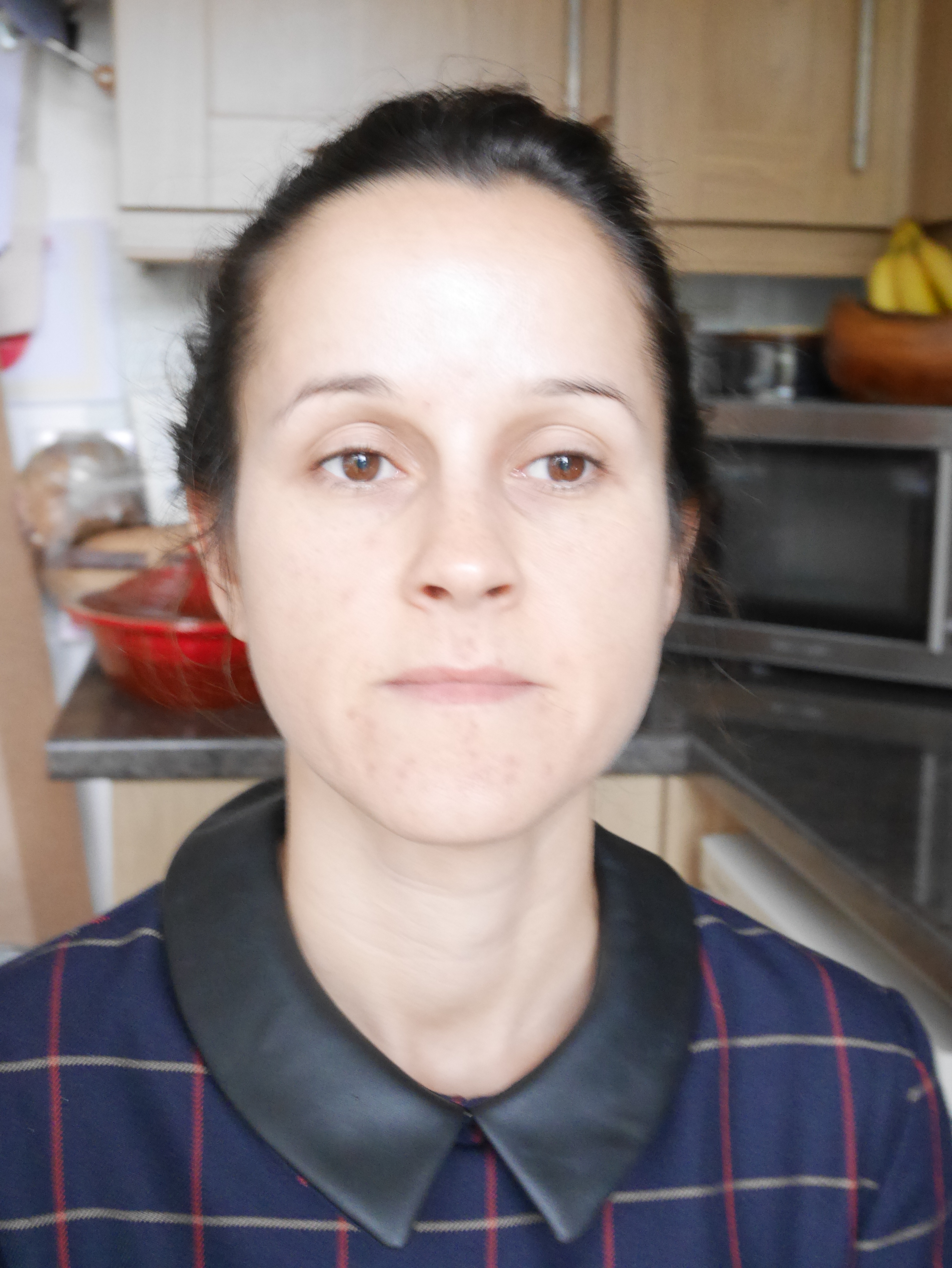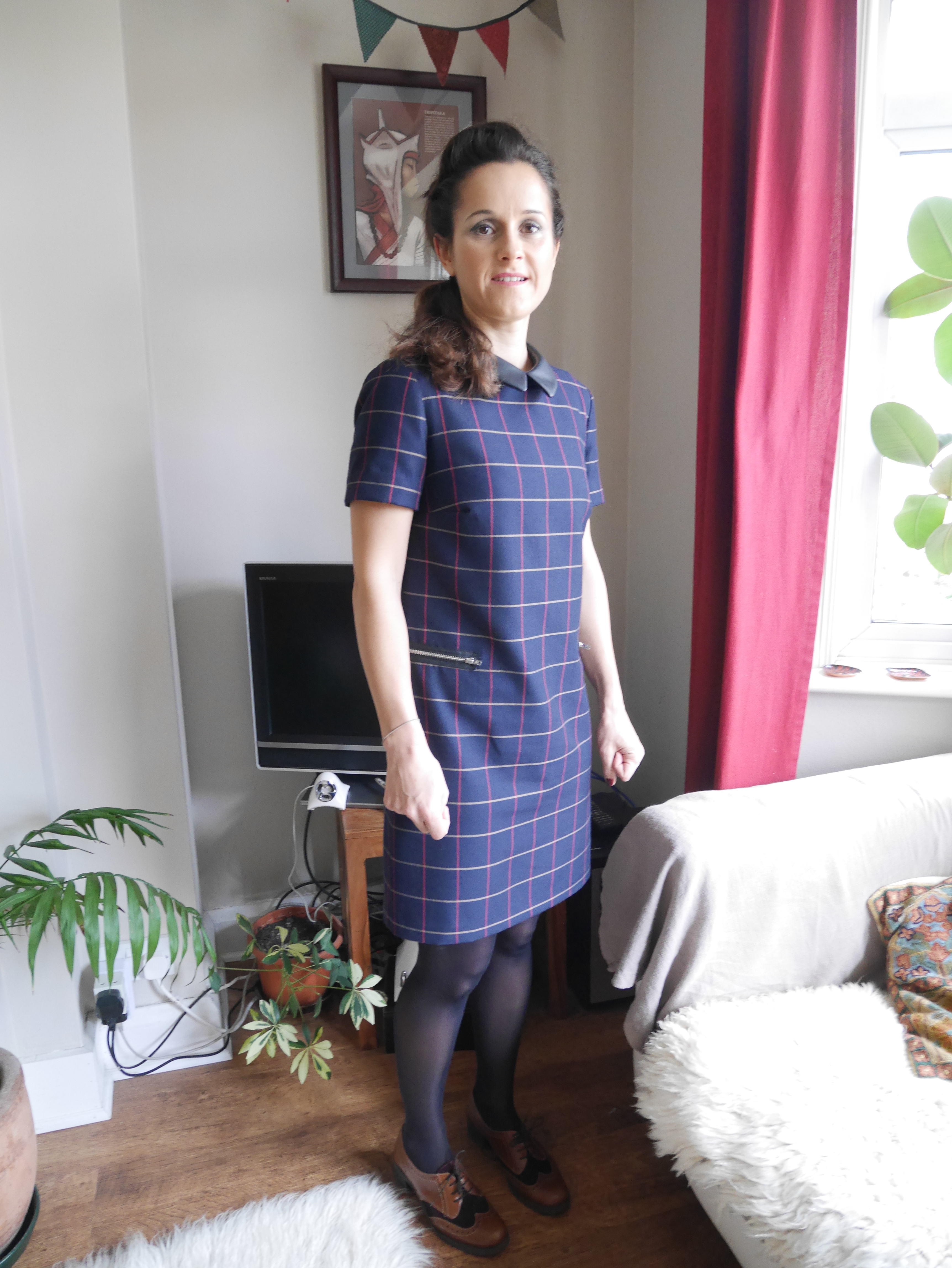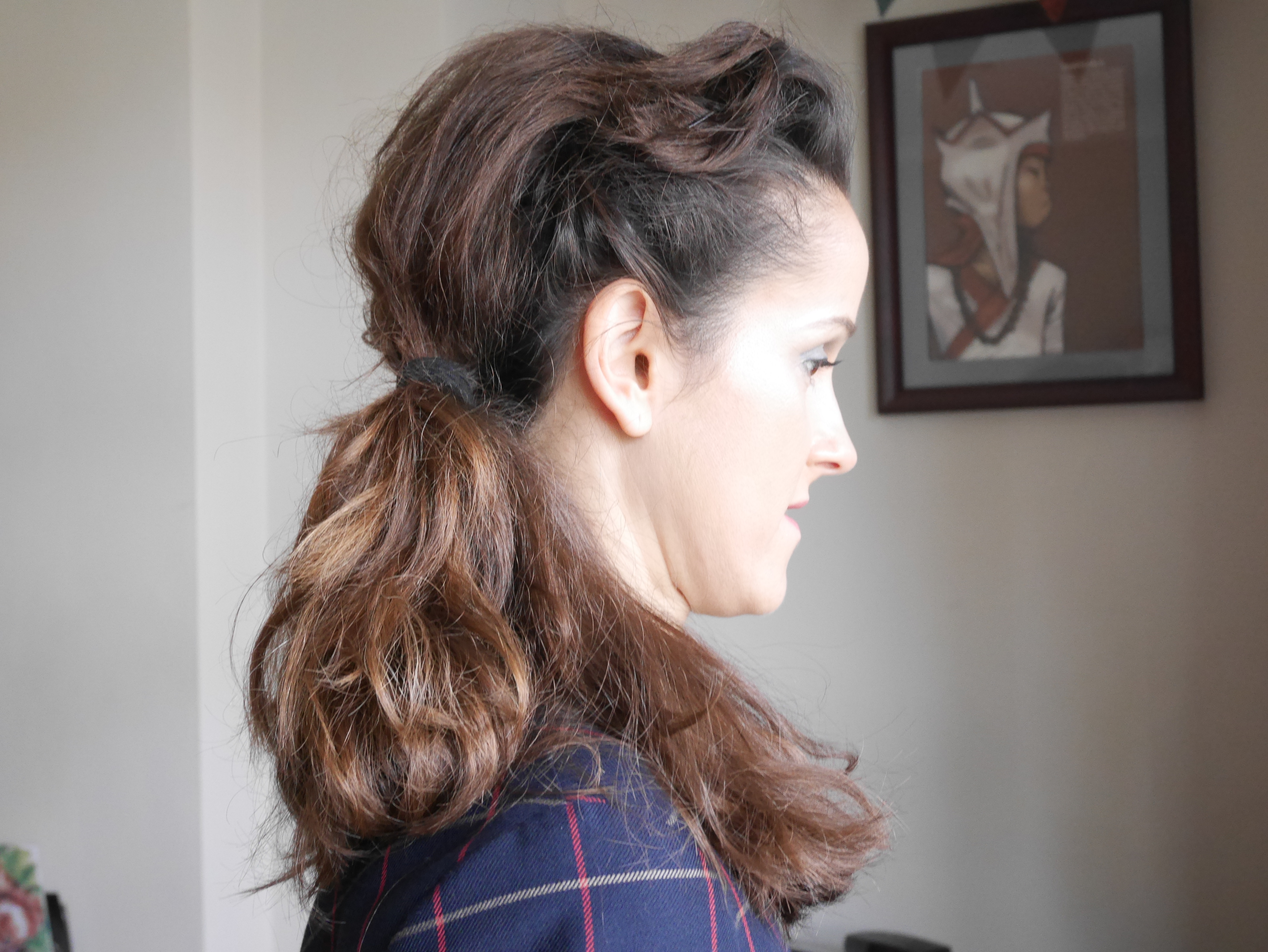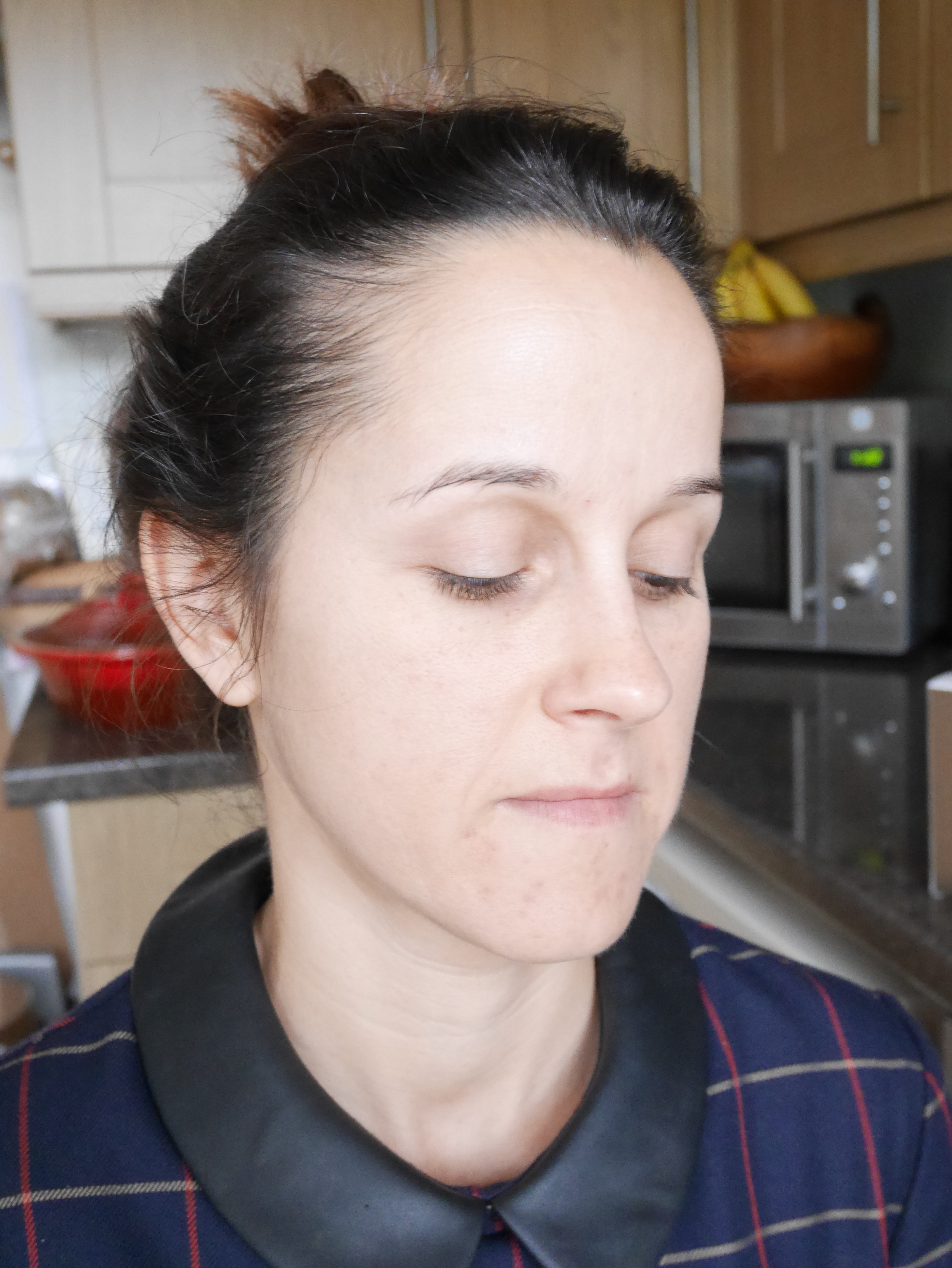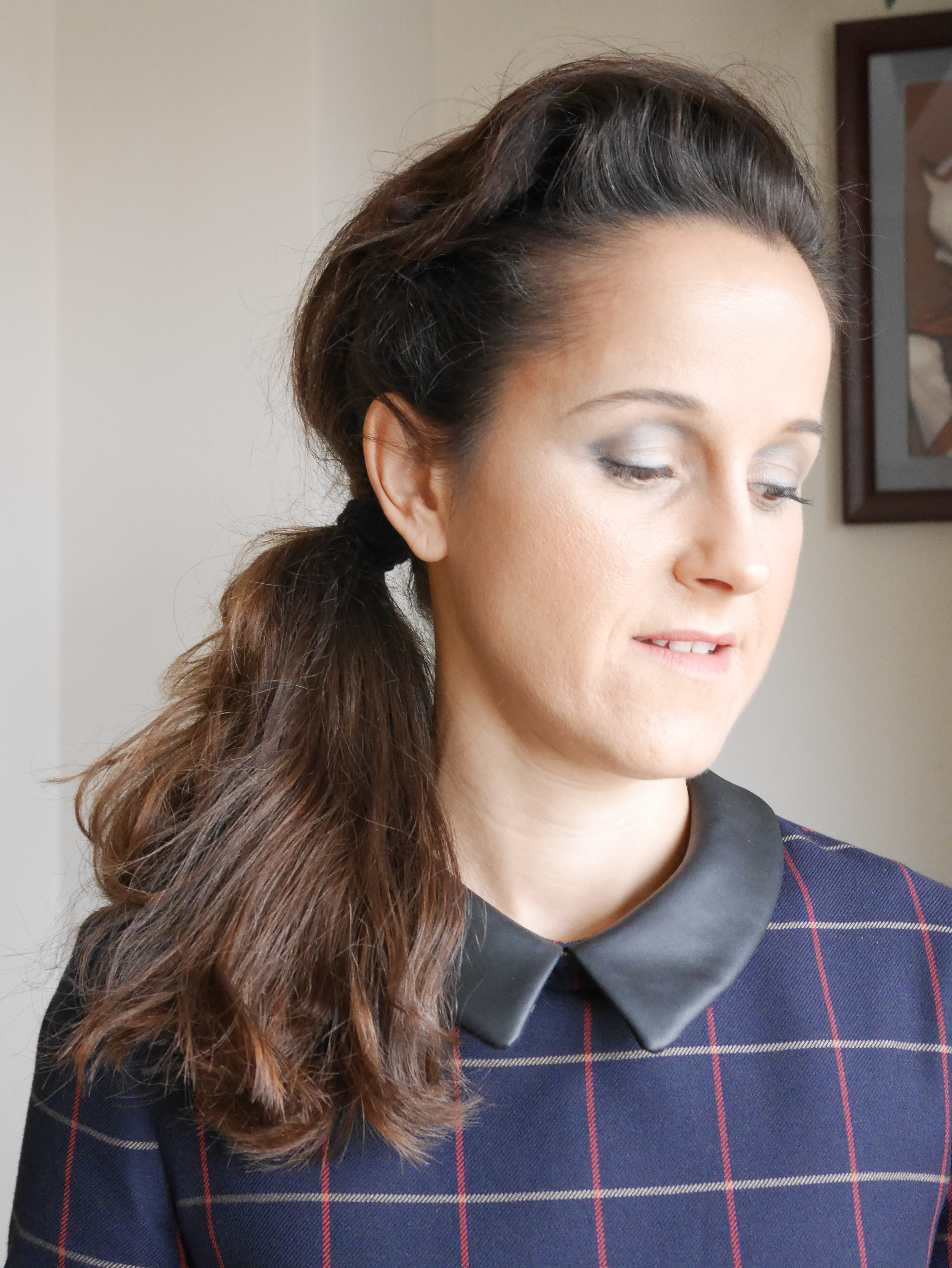 I prepared this look to suit Clare’s cute navy window pane check 60s dress from Warehouse with a peter pan collar. The makeup is a light version of the 1960s cut crease. The makeup has been brought up to date and kept sheer and luminous, rather than the traditional 60s flat, dense and opaque. Contouring has been confined to just the forehead and the jawline. Lipstick is dark pink lipliner with light pink lipstick on top, to add illusion of depth. The hair has been teased into a bouffant quiff or pompadour with side swept ponytail, the ends of which are lightly curled for effect.