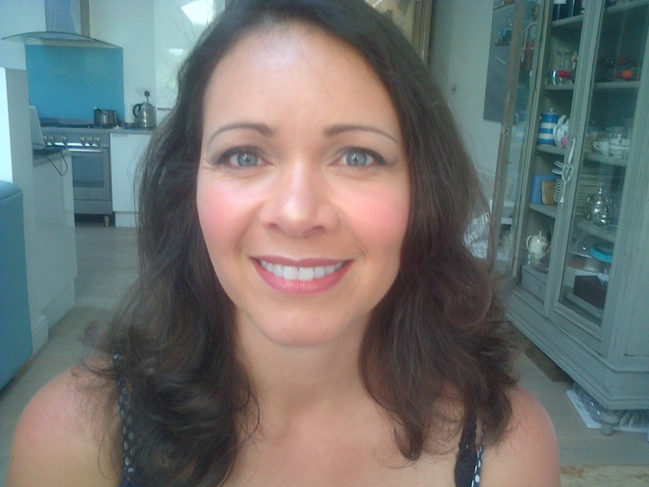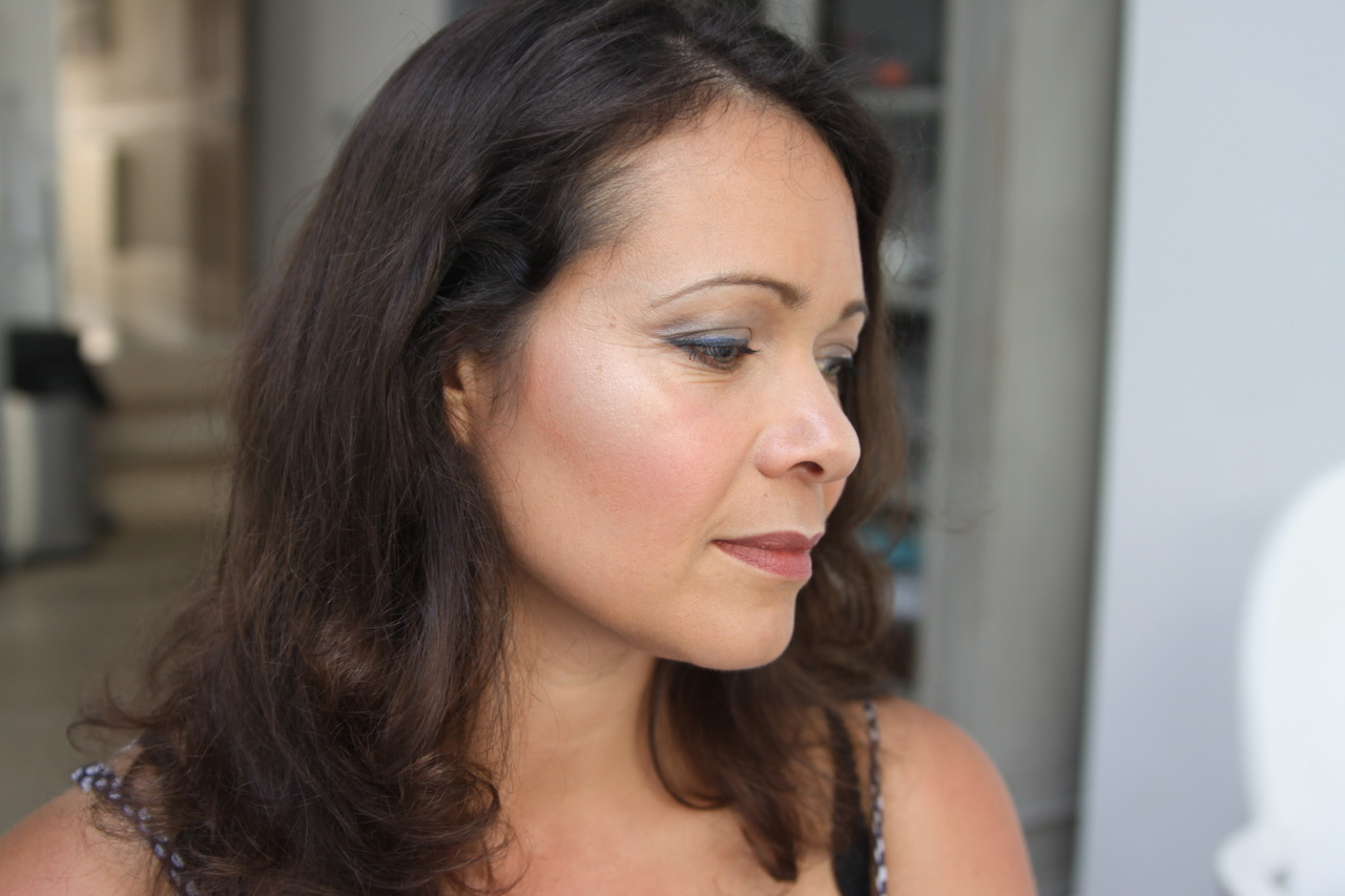 This is a light pretty look for a summer’s evening. Fiona has the classic ‘Snow White’ look – oval shaped face, olive skin and bright blue eyes and dark hair. The look I’ve created is one that shows naturally glowing healthy skin with navy blue eyeliner to set off her blue eyes. To do the smoky eyes ‘lite’, I’ve used a bronze palette with a subtle shimmer, and no black at all.